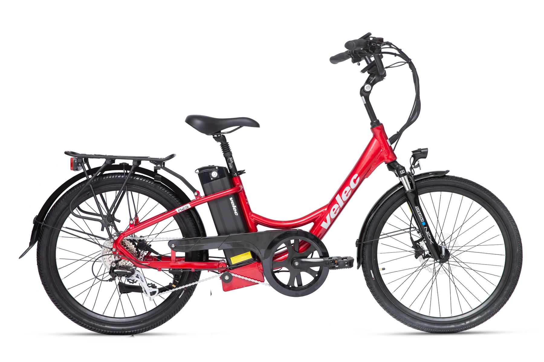 Velec is a Canadian ebike brand out of Quebec that we have been selling for a couple of years, and we've been very happy with the performance of the bikes and the support of the company. A versatile and easy to get on-and-off e-bike. The VELEC A2 is equipped with one of industry's quietest motor to let you ride comfortably and with confidence. Several battery choices are available to you depending on the desired range. The Velec A2 features 5 levels of electric pedal assist, cruise control, and a thumb throttle for easy starting. It can also be used as a traditional bicycle (without pedal assist). The bike is equipped with front and rear mudguards, LED front and rear lights, a rear rack, an adjustable stem, a suspension fork, a center screen, tires with puncture-proof extra protection, and front and rear hydraulic disc brakes with Motor cut-off.